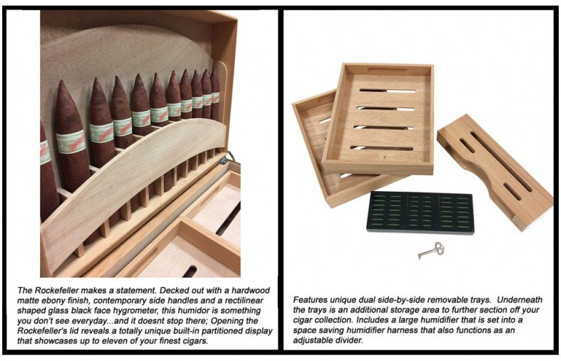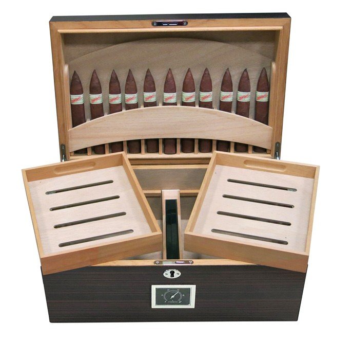 130 Ct. Ebony Matte humidor with built-in Eleven 64 Ring Gauge Cigar Display in Lid